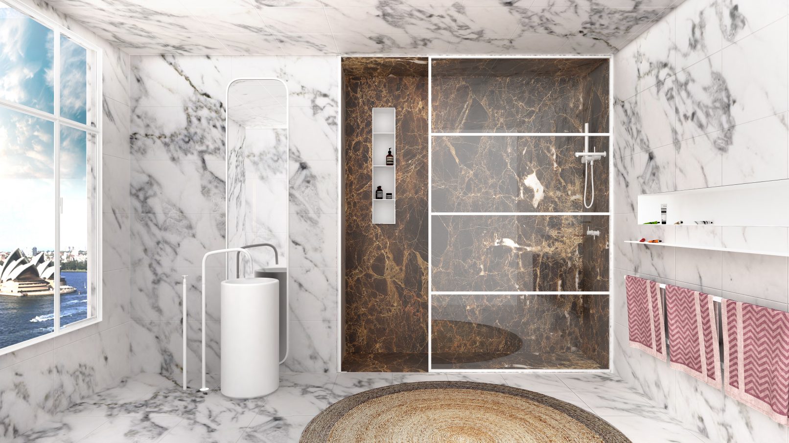 The white powder coat in this single fixed frame has been chosen to highlight the glazing bars against the darker shower tiles.